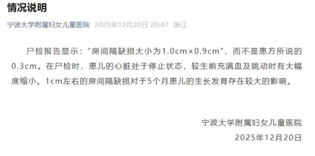报告明确显示,小洛熙的心脏存在1.0cm×0.9cm房间隔缺损,且冠状窦口未见异常,直接推翻了院方术前诊断的“复杂畸形”结论;医学共识中,5毫米以下无症状房缺1岁内自愈率超80%,而小洛熙的缺损尺寸已超出该范围,是否需要紧急手术需结合临床症状综合评估,但院方术前“不手术恐致脑瘫”的警示,显然违背了审慎的诊疗原则,涉嫌误导家属。更关键的是,报告指出手术切口未缝合、心脏残留补片等操作违规,结合病历中“22:03宣告死亡却22:20仍记生命体征平稳”的时间线矛盾,直接戳破了医院“手术成功”的说法,直指医疗操作的严重失范与刻意隐瞒。此外,尸检初步指向患儿死亡与肺静脉梗阻、肺水肿及心脏传导系统损伤相关,为后续因果关系认定提供了关键线索。
